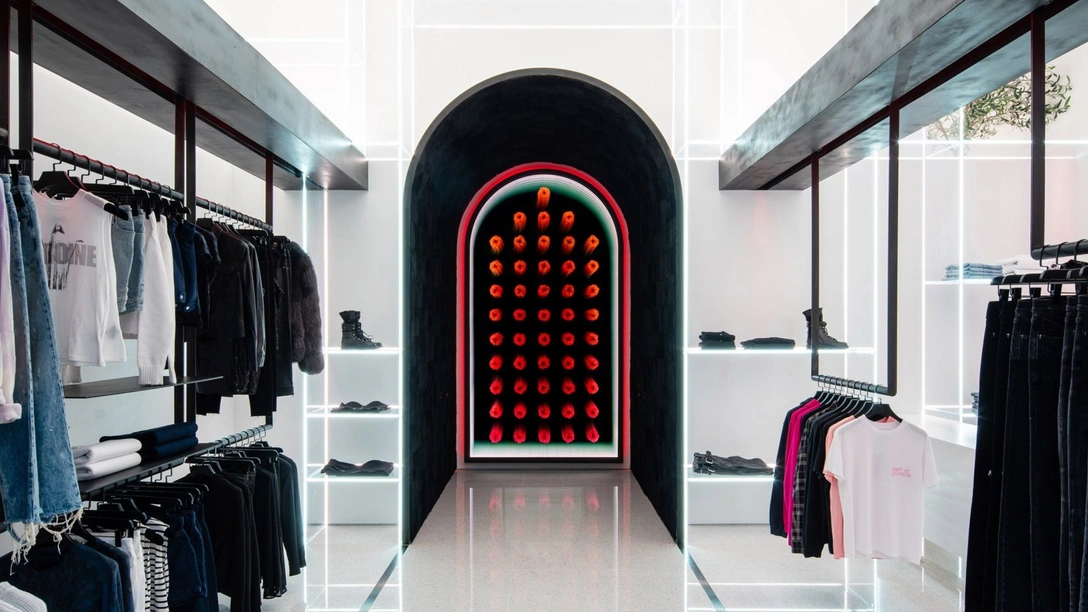 Вдоль центрального прохода с обеих сторон размещены рейлы с одеждой, а в торце находится другая арка — на этот раз декоративная ниша с цветочной инсталляцией, созданной художником Питером Гронквистом (Peter Gronquist). Ниша отделана изнутри черным мехом, «глушащим» любые отражения и блики, в глубине установлено зеркало, украшенное 49 красными розами, которые, отражаясь, создают иллюзию глубины, объема и бесконечного множества цветов.