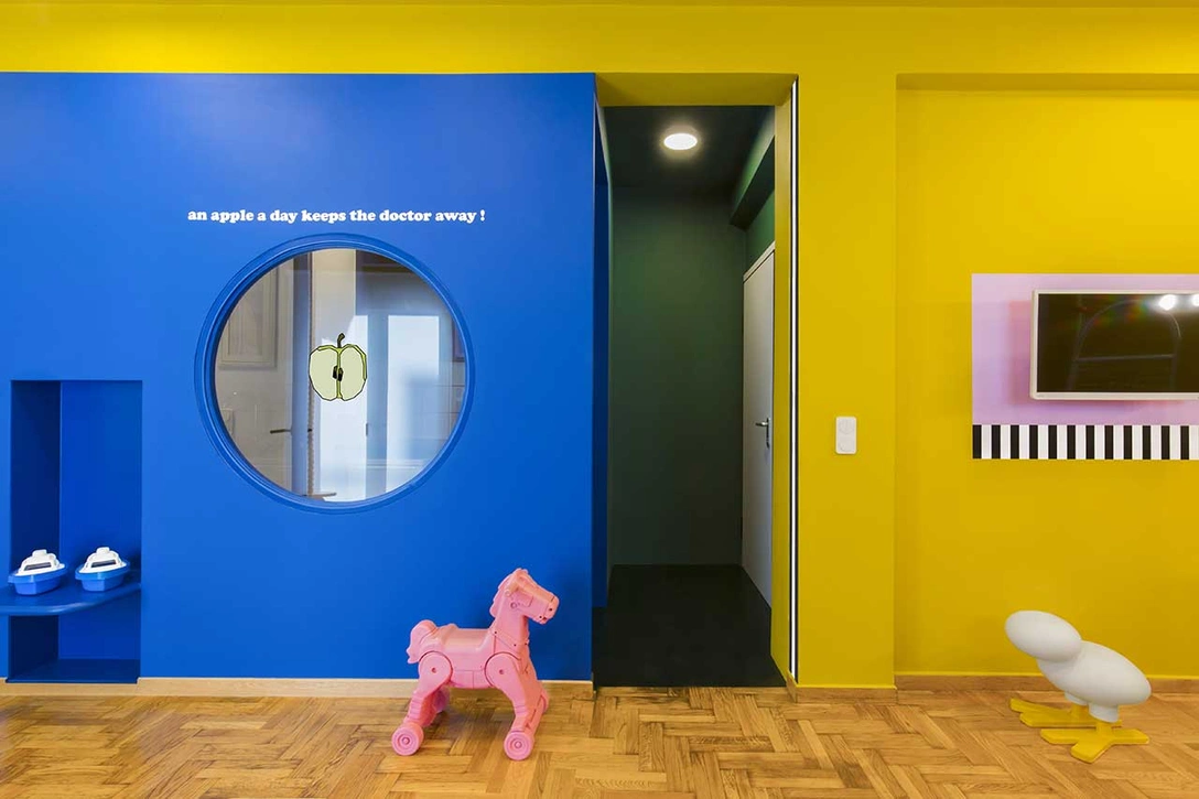 Дизайнеры превратили поход к врачу в занимательную игру, наполнив интерьер клиники яркими оттенками в духе группы «Мемфис». Изогнутые дверные проемы и круглые окна контрастируют с резкими углами прямоугольного пространства. В зоне ожидания, выделенной насыщенным желтым цветом, находится игровая площадка с канатами, стеной для скалолазания и другими развлечениями, которые могут занять детей до назначенного времени.