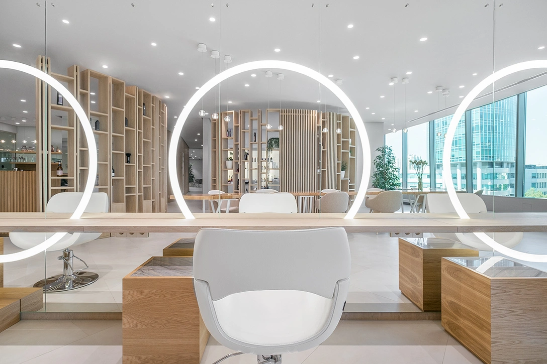 «В парикмахерском зале стоит отметить большое зеркало с кольцами-светильниками. Это и стилистическое решение, расширяющее пространство и необходимое с точки зрения правильной организации рабочего места парикмахера и визажиста. Здесь же находится и стол для маникюра. Его длина почти восемь метров. Для покрытия столешницы использовали несколько оттенков шпона, уложенного в геометричном рисунке под слоем акрила.»