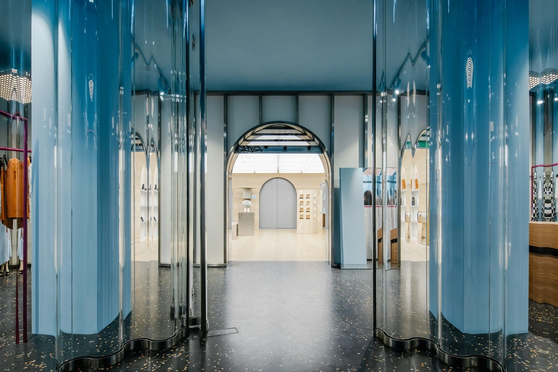 Новый флагман Off-White занимает три этажа здания XIX века, расположившегося в двух кварталах от Вандомской площади. Бутик, спроектированный студией AMO, задумывался как место, где французская классическая элегантность встречается с брутальностью индустриального стиля. Интерьер первого этажа вдохновлен обликом парижских внутренних двориков. Женская коллекция представлена на фоне ряда арок, облицованных травертином.