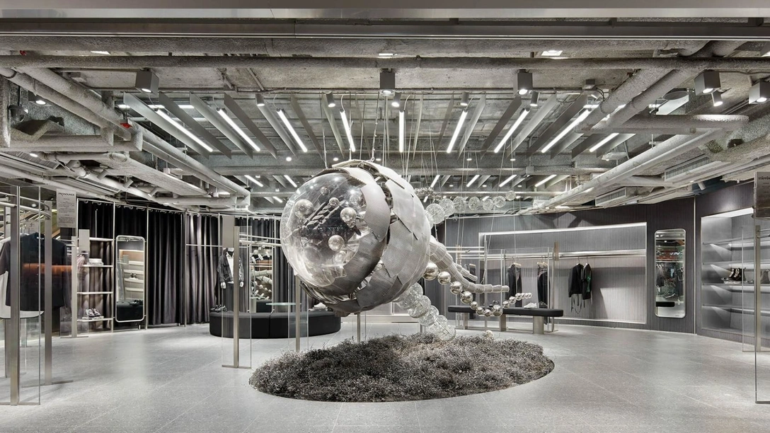 В пространстве бутика команда Leaping Creative создала нечто, напоминающее археологические раскопки — это то, как люди будущего могли бы увидеть нашу эпоху, если бы решили отправиться на поиски артефактов. И все же, в их проекте объекты говорят не только о промышленном наследии, но и трогательно напоминают органические формы жизни — как центральная инсталляция в форме медузы.