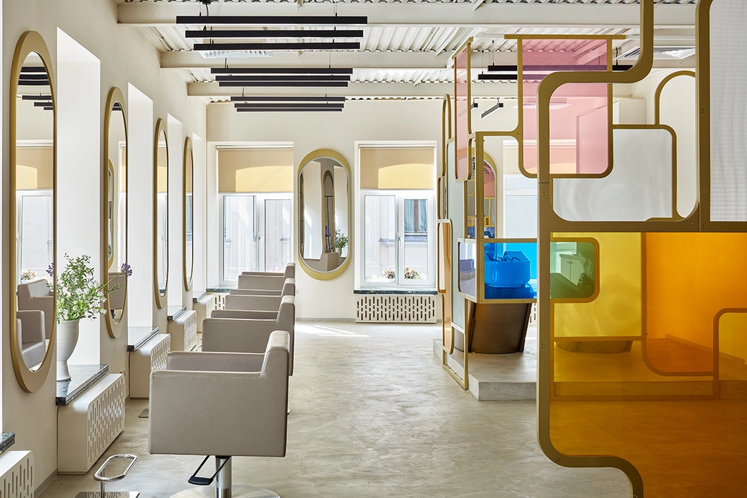 «Вместе с заказчицей мы создавали „красоту, в которой удобно творить красоту“. Иными словами, продумывали максимально комфортные условия для работы специалистов, особенно в условиях пандемии. Так, например, в маникюрные столы встроены лучшие на сегодняшний день пылесосы, в парикмахерском зале и в зоне мейкапа установлен профессиональный свет, позволяющий рассмотреть все нюансы кожи лица и увидеть истинный цвет блонда, без цветовых искажений, а для обеспечения максимальной приватности мойки в открытом зале развернуты и скрыты от посторонних глаз — этот прием подсказал Сергей Забалуев, технолог и представитель компании Welonda в России».