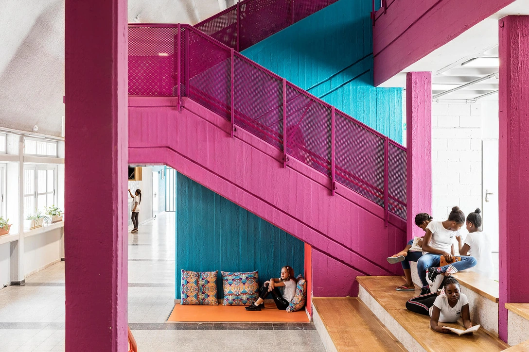 Проблема беженцев в Израиле более чем актуальна. В Тель-Авиве сейчас горячо обсуждается вопрос о том, как реагировать на наплыв мигрантов, ищущих убежища в Израиле, и в окрестностях школы Hayarden многие местные жители против их пребывания в стране. Поэтому когда дизайнерам израильской студией Steinberg Fisher преложили модернизировать старое здание 1960-х гг. площадью 200 м², они понимали: задача состоит не только в том, чтобы помочь объединить людей с помощью обновленного общественного пространства, но и в том, чтобы каждый ученик почувствовал себя частью общества, несмотря на все обстоятельства за стенами школы.