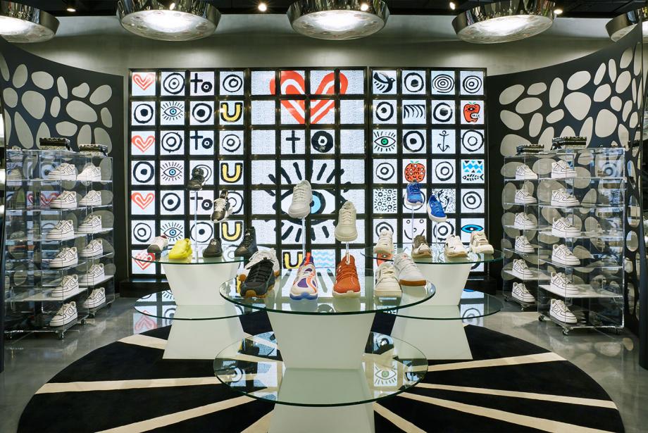Потолки концепт-стора украшают пятьсот светильников-прожекторов из хромированного металла и стекла, сделанных по эскизам Рухса.