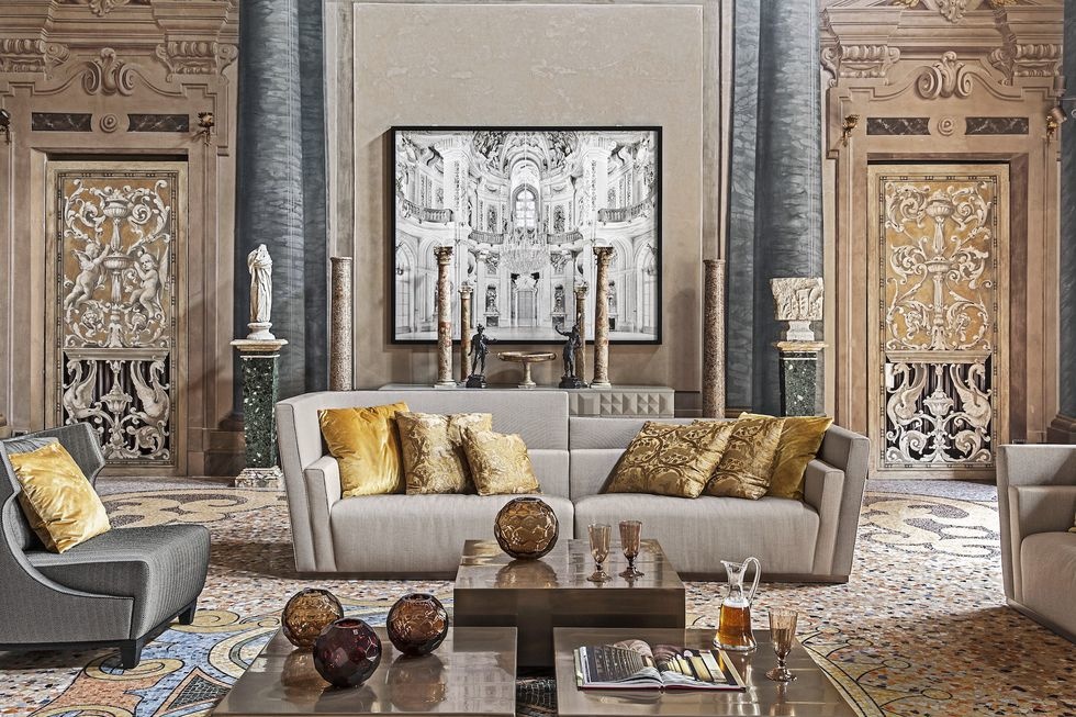 Как рассказывает Рафаэлла, оригинальное палаццо XIV века приказала разрушить местная графиня, подозревавшая владельца в убийстве своего мужа. До нашего времени сохранился средневековый вход, но большая часть дворца площадью 7 тысяч кв. м с искусными фресками и сложной мозаикой была перестроена в XVII веке. Украшенные антиквариатом и фотографиями, специально отобранными Гранжем, помещения палаццо стали идеальным фоном для коллекций Fendi Casa. «Я хотел передать настроение la dolce vita», — говорит декоратор.
