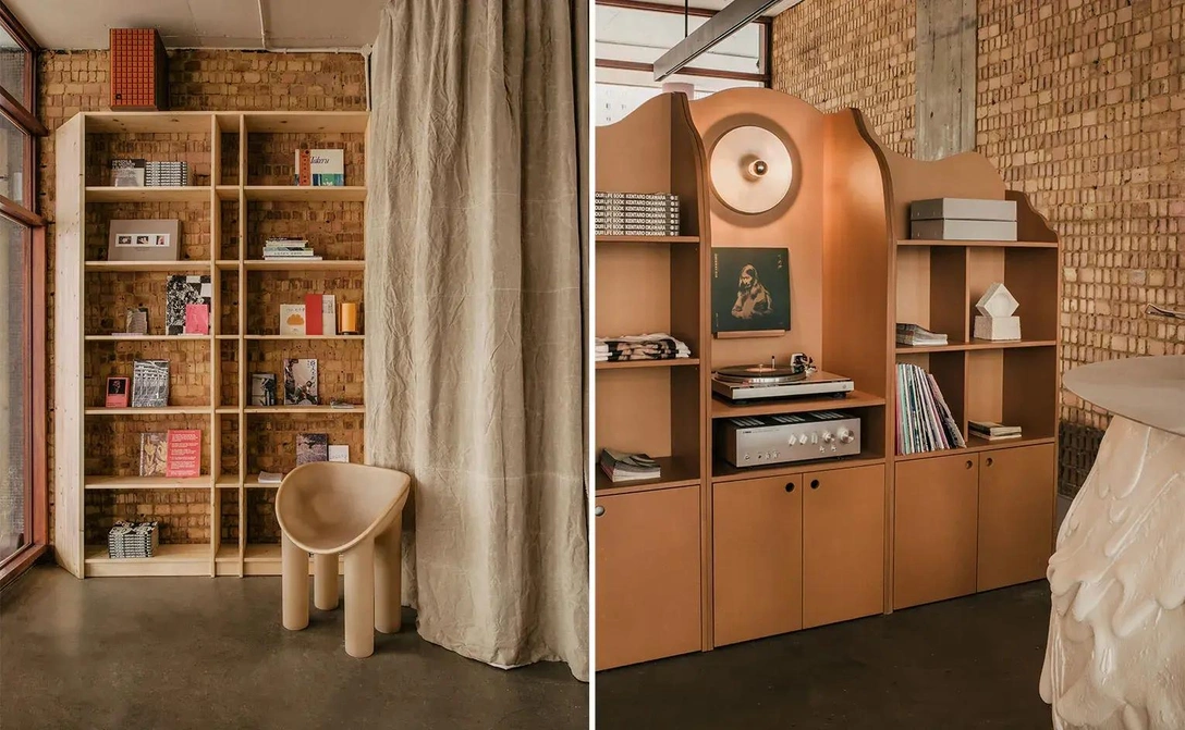 «Получилось гостеприимное и непринужденное пространство с продуманными деталями, которыми мы гордимся», — говорят основатели студии. Около входа находится общая зона, где проходят мероприятия, выставки и презентации книг. Здесь стоят асимметричные сосновые стеллажи и мебель по эскизам студии Toogood.