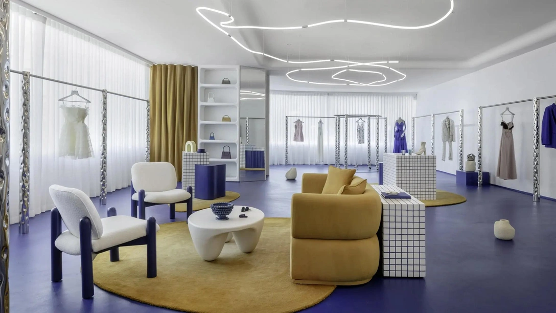 По всему магазину установлены облицованные белой плиткой тумбы с цветной затиркой. Они работают витринами для аксессуаров, как и невысокие кобальтовые столики. «Сочетание органических и геометрических форм в дизайне — это попытка отразить двойственность, лежащую в основе идентичности бренда, — рассказывают авторы проекта. — Контрастные элементы по всему пространству воплощают идею гармоничного сосуществования женского и мужского начал, силы и женственности».