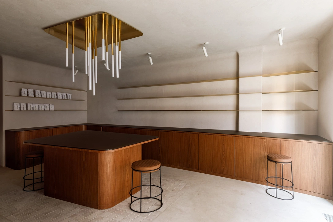Квадратное помещение 60 м² поделено на несколько зон: пространство магазина Pure, офисная часть с кабинетами для индивидуальной работы с клиентами и зона кухни-гардероба, которые совмещены и скрываются за гладкими фасадами шкафа.