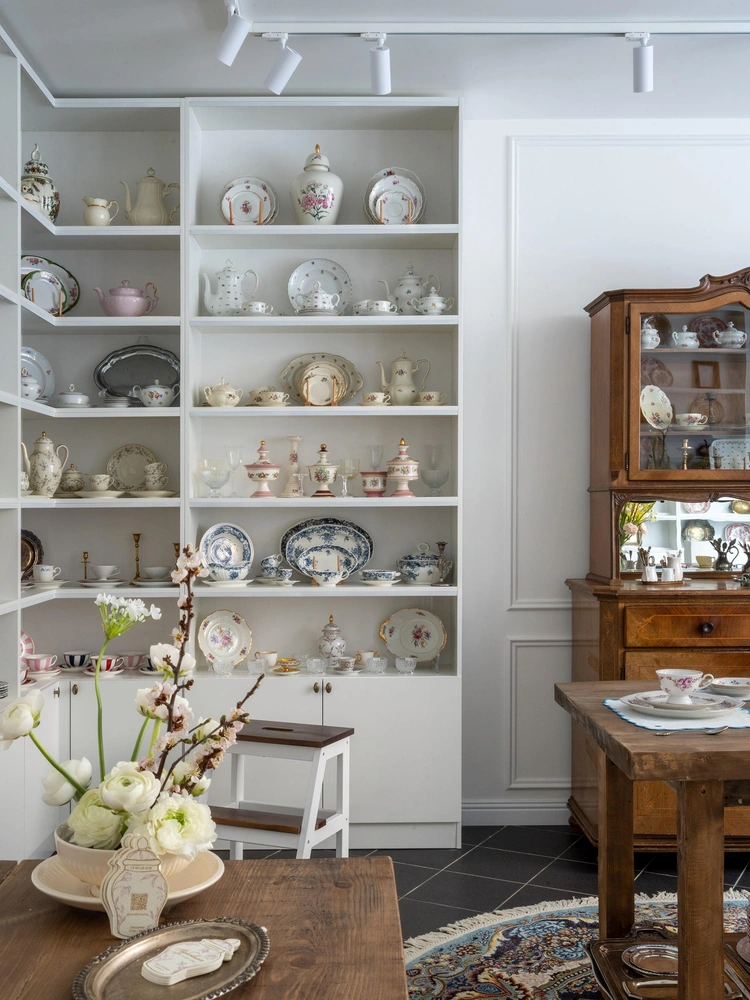 С заказчицей Юлией мы познакомились как раз в то время, когда она хотела открыть свой первый магазин винтажной посуды и декора — до этого она продавала свои находки онлайн. На первой встрече мы сразу поняли, что интерьером магазина займусь я. В итоге я не только разработала дизайн-проект, но и помогла остановиться на выборе помещения — это было очень удачное место: окно и дверь в магазин выходят на улицу, уровень пола ниже ее уровня — широкий подоконник словно является продолжением пешеходной части, поэтому магазин виден прохожим как на ладони.