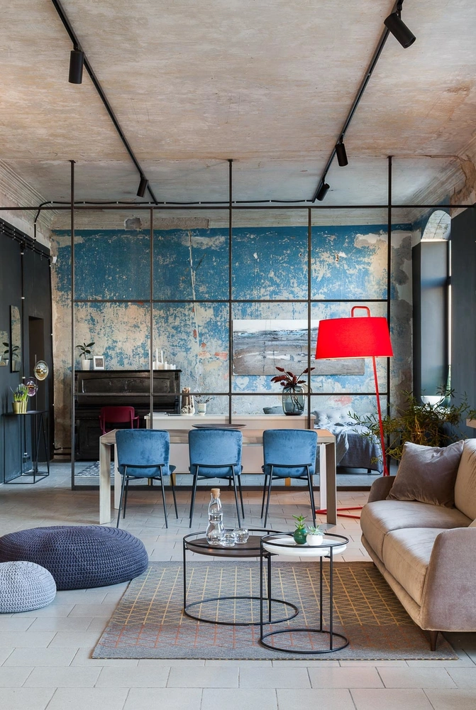 «Для того чтобы интерьер не выглядел незаконченным, нам необходимо было добавить современные штрихи. Ими стали графитовые и белые плоскости с идеальной отделкой, технологичными трековыми светильниками и модной мебелью. Рискованным приемом была покраска стен холла поверх многократно выкрашенной плитки. Поэтому мы выбрали яркий современный вишневый цвет и не прогадали: он взял на себя главную роль, доказав, что эти стены ничего не стыдятся. Живые растения привнесли динамику и свежесть в контрасте с „руинами“».