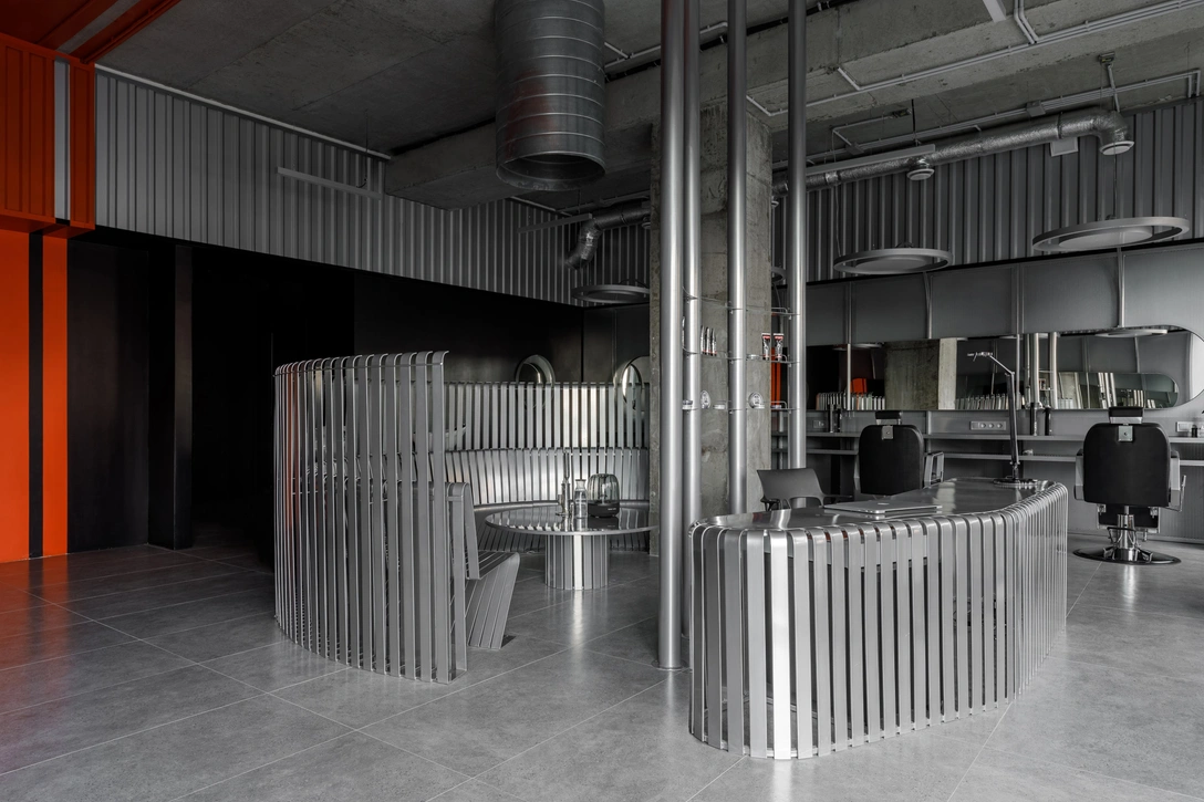 «Вдоль стен расположены рабочие места и кресла для клиентов. Длинные консоли для инструментов парикмахеров похожи на приборную панель в машине, а вытянутые зеркала длиной во всю стену выглядят как зеркала заднего вида. Цветовая палитра интерьера состоит из оттенков серого: теплого и холодного, матового и хромированного. Зеркальные блестящие поверхности контрастируют с матовыми стальными. Яркая оранжевая полоса, проходящая через стену и потолок, придает динамики монохромному пространству и напоминает линии на гоночных автомобилях».