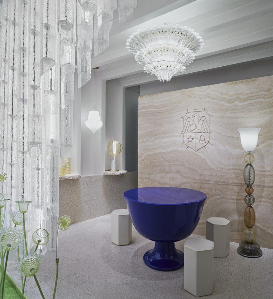 Интерьер бутика, созданный дизайнером Лукой Никетто (Luca Nichetto), почетным венецианцем и большим поклонником стеклодувного дела, напоминает о почтенном возрасте бренда. Потолочные балки старого здания подсказали дизайнеру идею создать серию арок, которые увеличивают глубину пространства. Венецианское терраццо и современный гладкий бетон в отделке гармонично сочетаются с необработанным камнем.