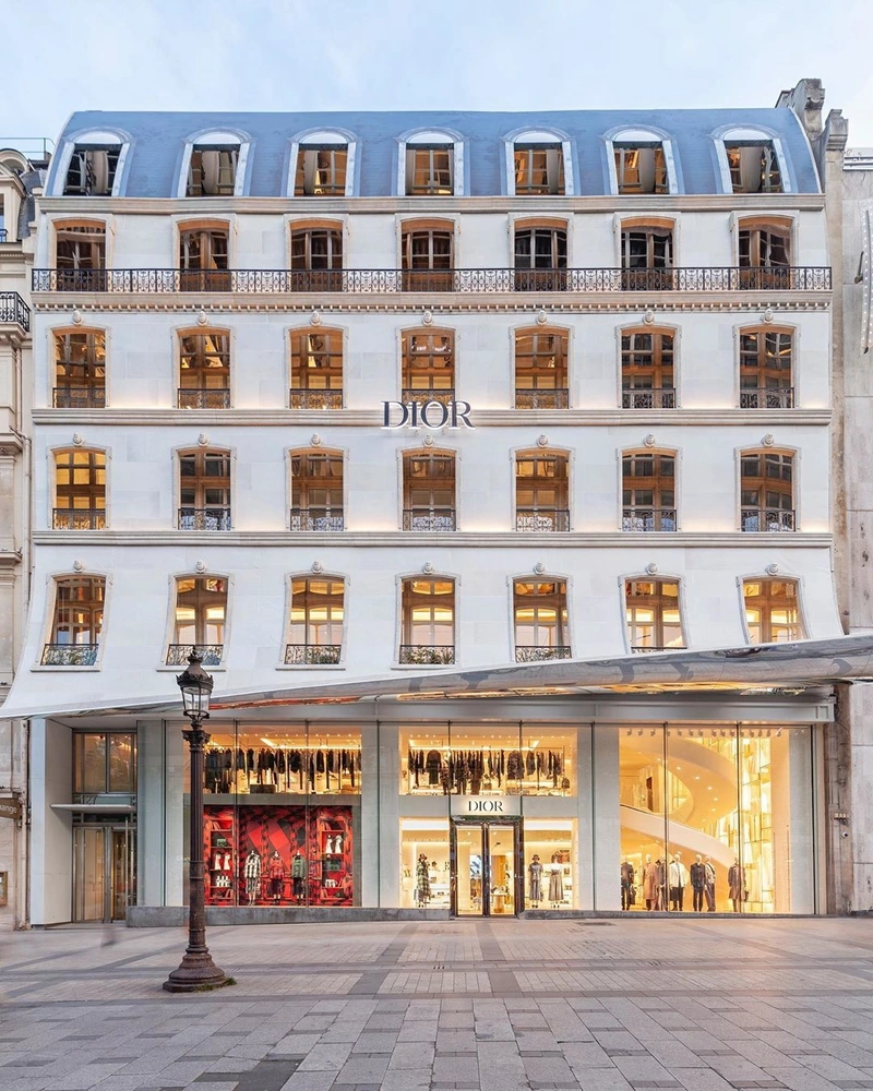 Трехуровневый магазин общей площадью 890 кв м расположился по адресу Елисейские Поля, 127 и представляет собой настоящее царство чистой, минималистичной архитектуры и оттенков пудры. Главное украшение интерьера — большая винтовая лестница со стеклянными перилами, напоминающая ленту и соединяющая все три уровня магазина. Проходя по ней, посетители могут любоваться выставленными на латунных стеллажах у стены моделями женской и мужской одежды белого цвета, которые служат необычным декором и как-бы приглашают совершить путешествие в волшебный мир Dior.