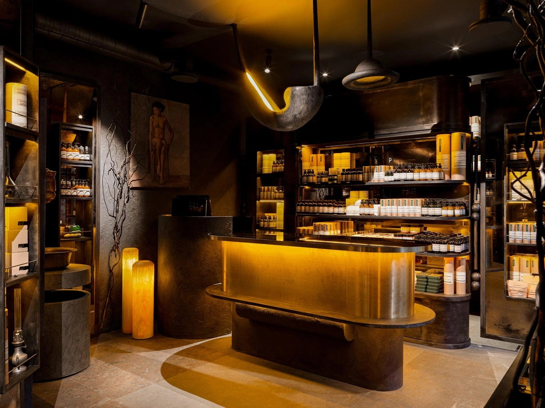 Мягкие медные и янтарные акценты выглядят на темном фоне теплыми и манящими, как и само помещение, наполненное волшебными ароматами».