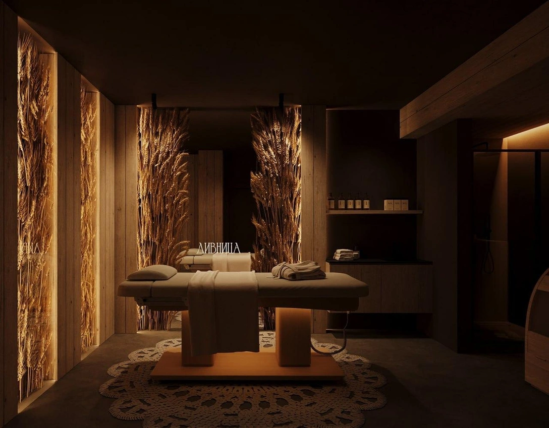Мы намеренно пошли по непростому пути — не стали использовать популярный балийский стиль или создавать стандартный салон высокого класса. Решили переосмыслить старое и создать новое. Мы постарались передать широту русской души, атмосферу бескрайних полей, поэтому в интерьере используются злаки: рожь и остроцветковый вейник. А культурный код подчеркивают три важных элемента: