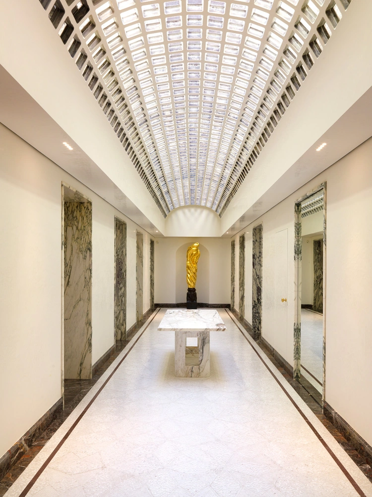 Марино выбрал современную интерпретацию популярного в 1920-е годы стиля рационализм, отличавшегося приверженностью к строгим формам и лаконичному декору. В своей работе архитектор использовал дорогие разновидности мрамора, такие как тосканский breccia medicea и благородный фригийский pavonazzetto. Ими облицованы полы, пороги и порталы дверей, а также мебель, специально спроектированная для этого проекта самим Марино.