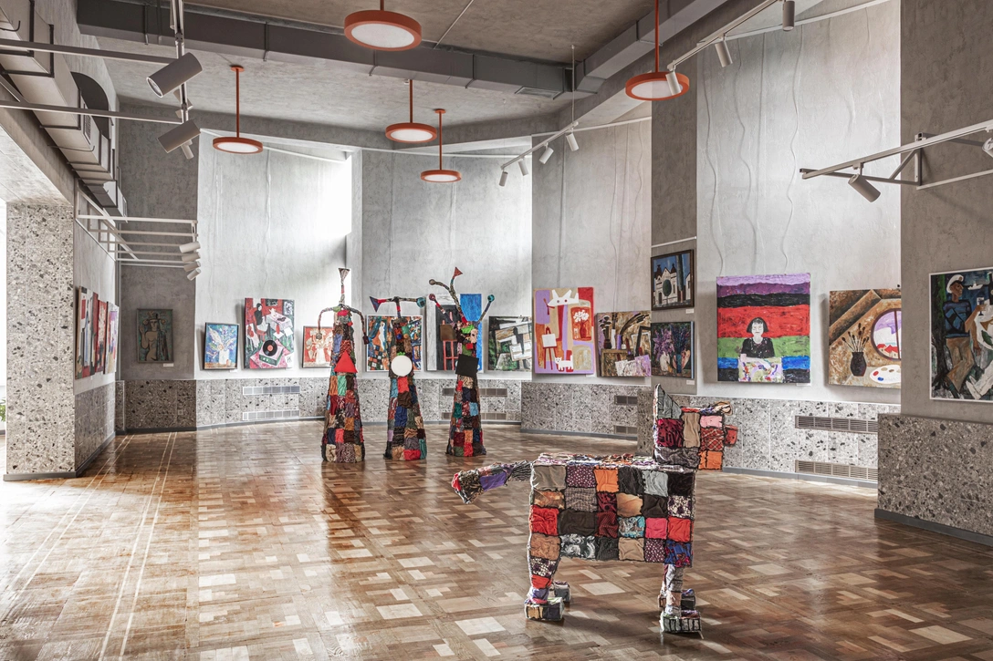 Особое внимание в проекте уделено небольшой комнате, которая изначально была оформлена дерматиновыми панелями. Во времена выставки «В холодном климате, с любовью» там находилась инсталляция: живые цветы и УФ-лампы, напоминающие о местной традиции использования фитоламп для домашних растений. Неоновая надпись с названием выставки натолкнула основателя студии «Точка дизайна» Степана Бугаева на идею соединить акцентный розовый с коричневой отделкой стен. В итоге дерматин убрали из соображений пожарной безопасности и заменили коричневыми гипсовыми панелями, но общая расслабленная атмосфера была сохранена. Эту неформальную комнату полюбили посетители, и даже глава местной администрации частенько проводит там планерки и онлайн-встречи.