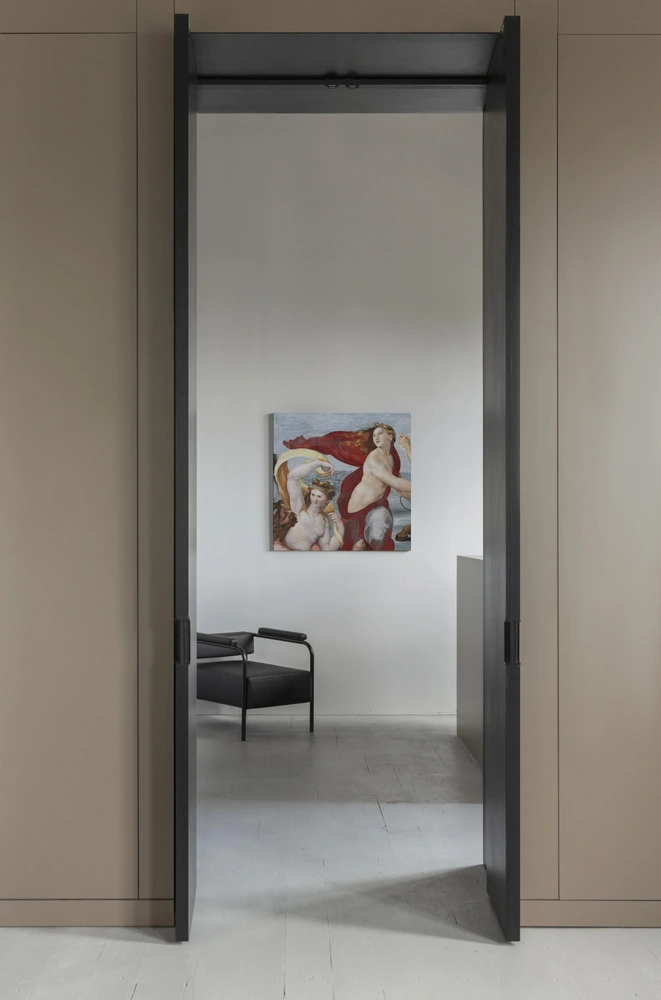 «В качестве цветовых акцентов использовано ламинированное ДСП сложного коричневого оттенка, из которого выполнена основная мебельная перегородка, — комментируют архитекторы. — Контрастным дополнением был выбран глубокий черный цвет, который подчеркивает графичность остальных элементов. Фрагмент фрески Рафаэля „Триумф Галатеи“ поставил колористическую точку в образе интерьера, замкнув главную перспективу анфилады и связав современную эстетику минимализма и живую красоту Возрождения».