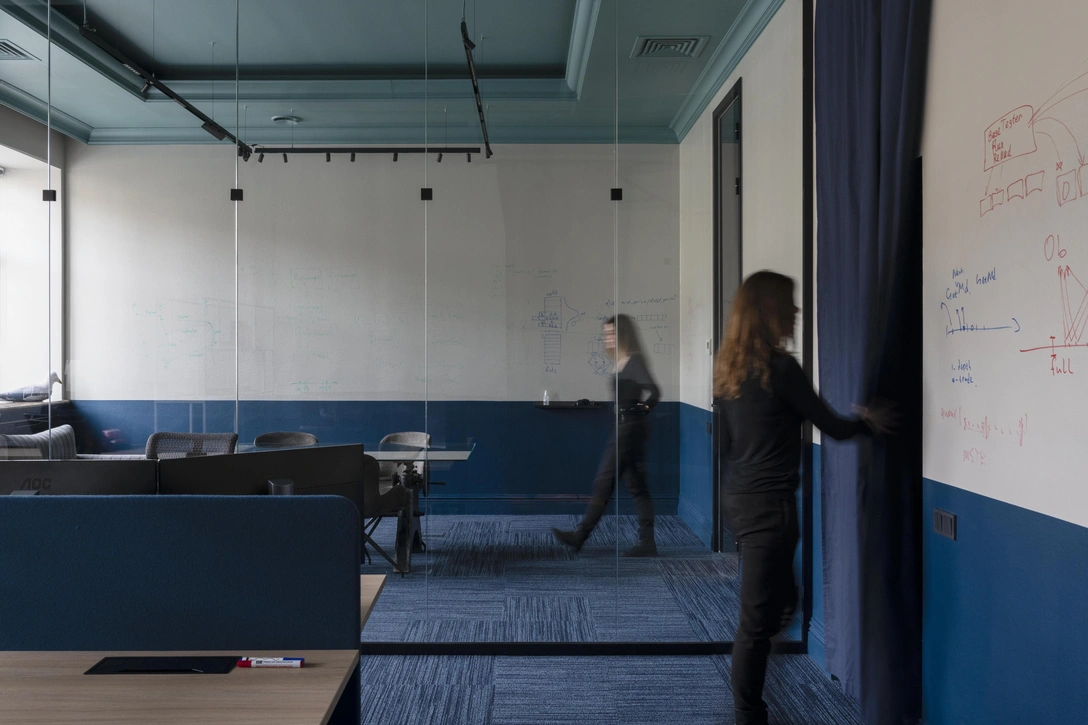В двух основных рабочих залах с высокими лепными потолками сочетаются три цвета: насыщенно-синий в основе пола и нижней части стен, разбивающий помещение по горизонтали, потолок цвета медной патины и светло-бежевый блок, выкрашенный маркерной краской и предназначенный для временных рабочих записей, которые сами по себе становятся элементом интерьера. За акустические решения отвечают индивидуальные фетровые перегородки в цвет стен и мягкое ковролиновое покрытие, поглощающее звук шагов и речи.
