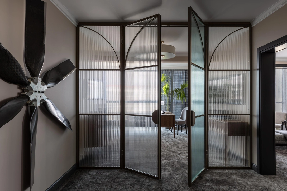 Один из любимых всеми предметов в комнате переговоров — барная стойка из натурального камня. Чаще всего она служит рабочим местом, с которого открывается прекрасный вид на Финский залив. В малом кабинете, декорированном гравюрами, можно уединиться для работы с ноутбуком.