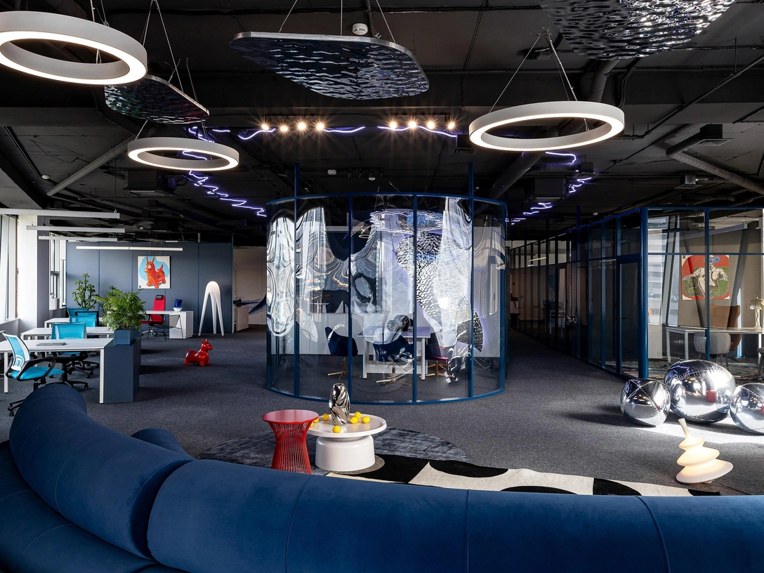 Основной задачей было организовать пространство с учетом особенностей помещения, стиля жизни и работы сотрудников. Так появилась просторная лаунж-зона с комфортным диваном и проектором, где сотрудники устраивают кинолектории и проводят мероприятия. А также две переговорные: малая — для неформального общения в расслабленной атмосфере, и большая — с радиусным остеклением, повторяющим форму помещения, и футуристичным арт-объектом.
