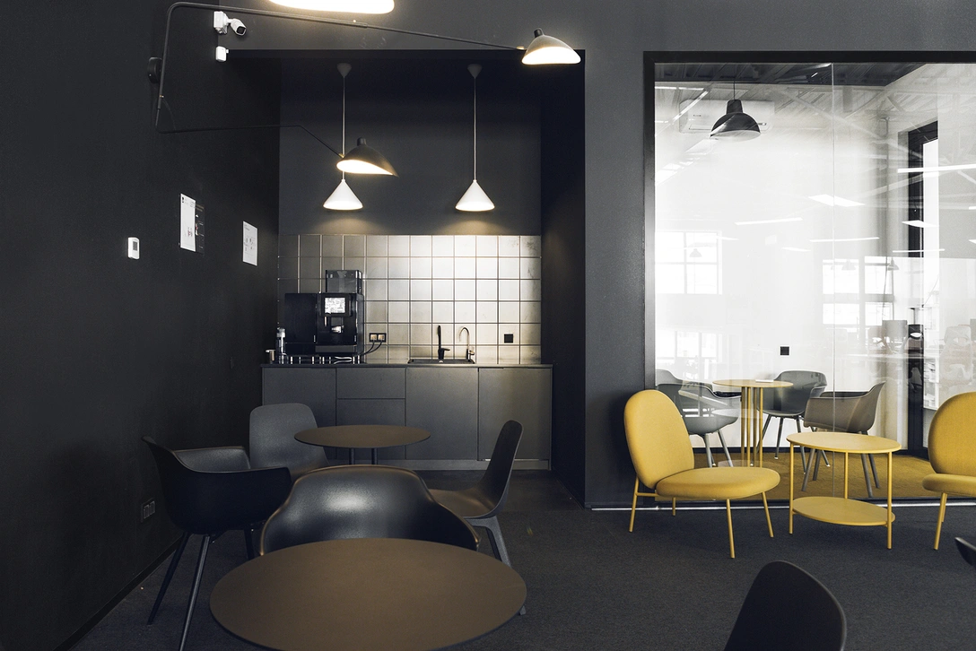 «В офисе также предусмотрено 100 стационарных рабочих мест и около 50 незакрепленных. Система освещения позволяет легко менять расположение столов в зависимости от потребностей сотрудников. Цветовое решение интерьера было разработано в соответствии брендбуком компании и палитрой фабрики, которая раньше находилась на этом месте».