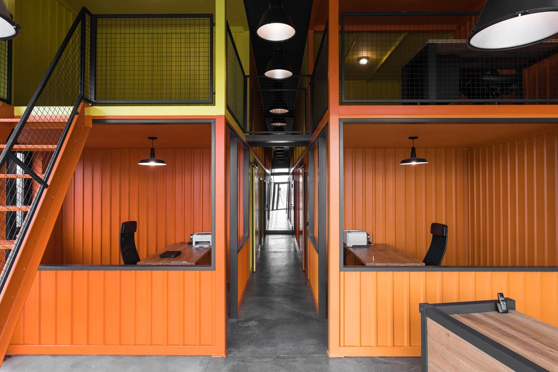 Офис расположен в заводском здании. Вытянутое в длину пространство разбито на разноцветные «коробки»-контейнеры, стоящие в два этажа, — так дизайнеры задействовали высоту помещения и разместили на втором ярусе дополнительные рабочие места. А чтобы поддержать промышленную тему в интерьере использовали металлические решетки, светильники, дверные ручки и выключатели в индустриальном стиле и грубоватую мебель в стиле лофт.