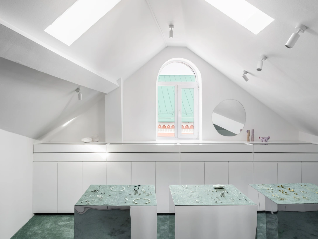 «Помещение находится на мансардном этаже — благодаря этому здесь много естественного света, что очень важно для ювелирного бутика. Особенность зала заключается в необычной геометрии потолка, которая в сочетании с видом лазурную крышу монастыря, открывающимся из окна, напоминает о греческих морских пейзажах. Чтобы усилить эффект мы решили использовать материалы, цвет которых перекликается с оттенком крыши, благодаря чему пространство словно выходит за пределы стен».