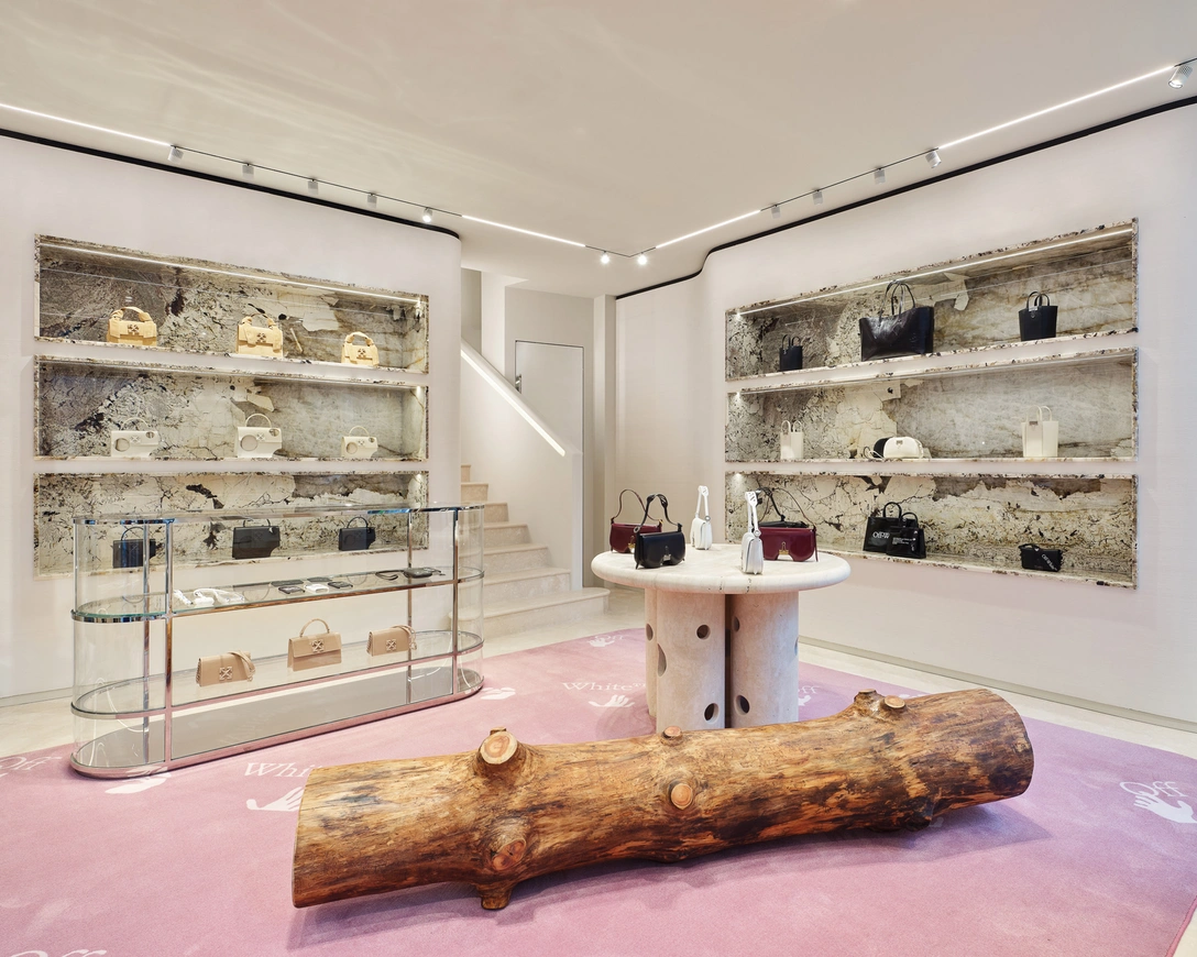 Первый бутик модного бренда Off-White в Милане по проекту Вирджила Абло (Virgil Abloh) отличается элегантной и современной эстетикой, которая находит максимальное выражение в деталях и используемых материалах. В первом зале, «упавшее» дерево создает контраст с белым травертиновым полом и розовым ковром. Женская коллекция сумок разместилась в мраморных нишах, которые соседствуют с конструкциями из стекла и металла.