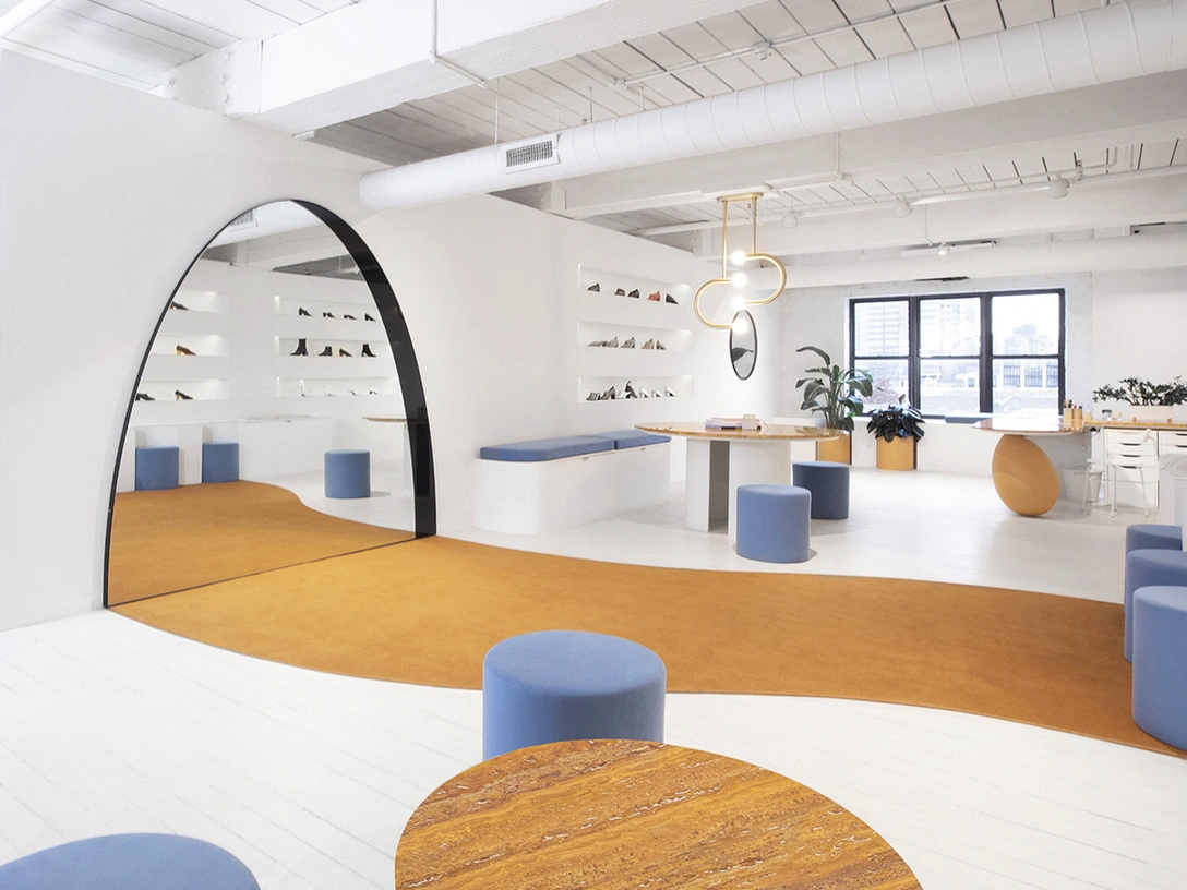Студия Bower, которая также любит эксперименты с формой, как и Сильвия, помогла оформить дизайнеру новый обувной шоу-рум площадью 185 кв. м в Бруклине. Центральным элементом пространства стало гигантское зеркало в форме арки, произведенное на заказ, но оранжевая ковровая дорожка, круглые основания столов в тон и нежно-голубые пуфы перетянули почти все внимание на себя. Интерьер получился одновременно ироничным и элегантным, и все его элементы по форме, материалам и цветам перекликаются с обувью на витринах.