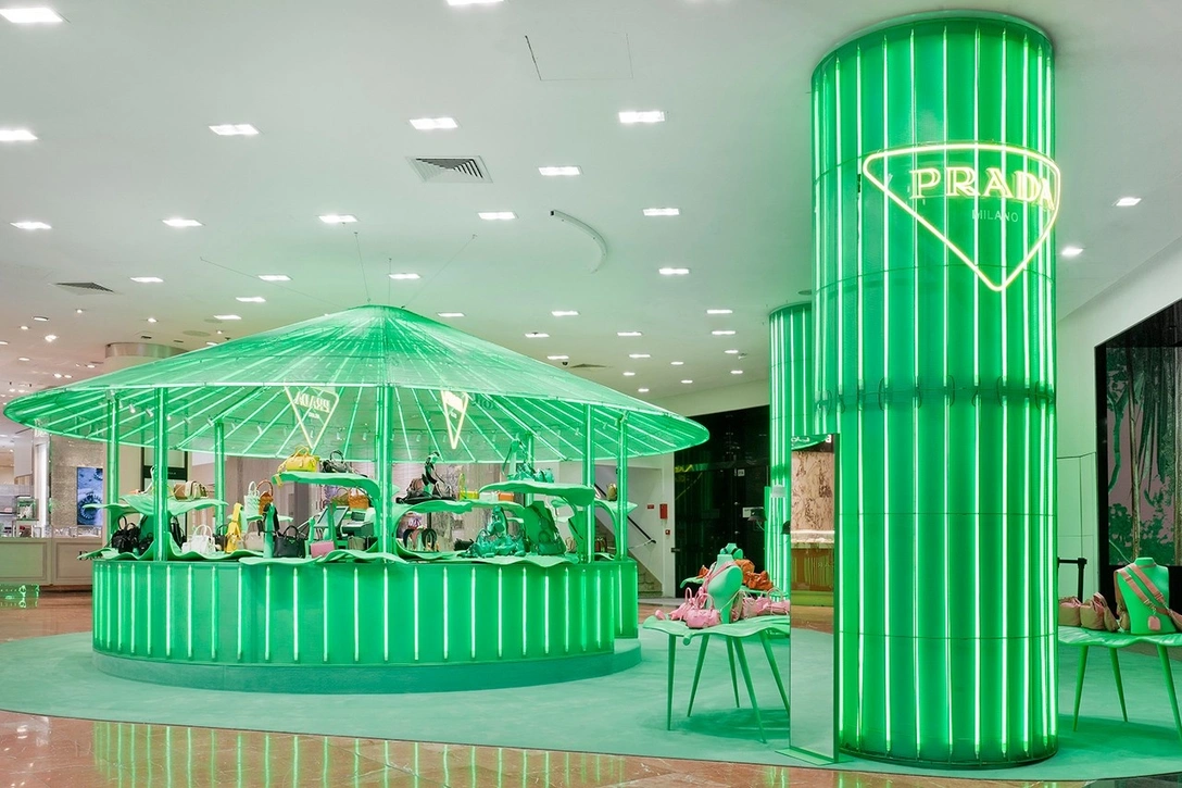 В качестве фона в витринах использованы обои с подсветкой, на которых изображены природные пейзажи, дополненные неоновыми треугольниками Prada в фиолетовом, зеленом и желтом цветах. Обувь и аксессуары выставлены на столах в виде огромных листьев алоказии.