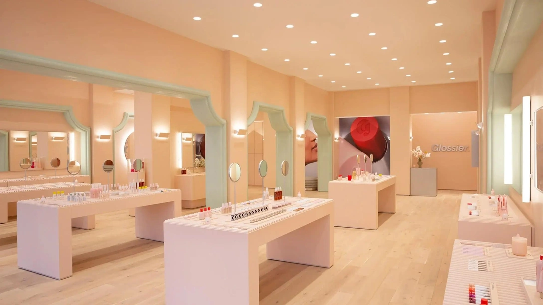 Зеркала на стенах расположены так, чтобы множить отражения и создавать иллюзию бесконечности. Товары выставлены на рифленых столешницах, округлых витринах и косметических столах, которые можно найти во многих магазинах Glossier. Дополняют мягкую пастельную палитру полы из светлого дерева.