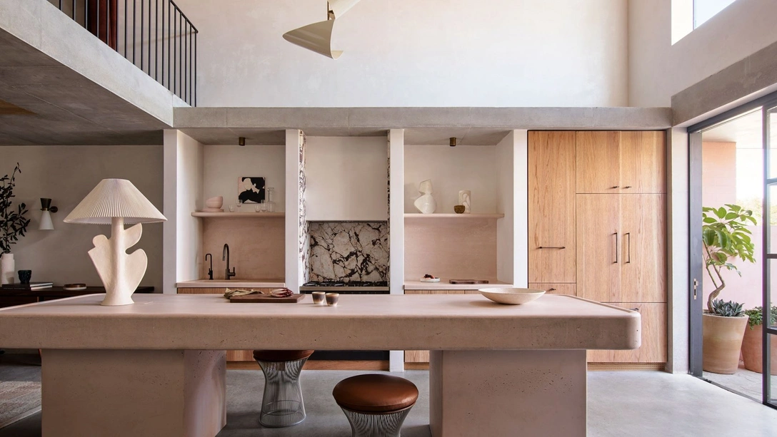 Той же цели служит и обстановка дома, большая часть которой изготовлена на заказ местными мастерами-ремесленниками и производителями. Это и розовая уличная мебель из переработанных строительных отходов от компании RE. Studio Collective, и розовый кухонный остров весом в полтонны и длиной 6 метров (работа мастеров Concrete Bespoke), и шестиметровая банкетка из ореха в столовой, на которой умещаются все 23 сотрудника студии, и деревянные стеллажи в библиотеке.