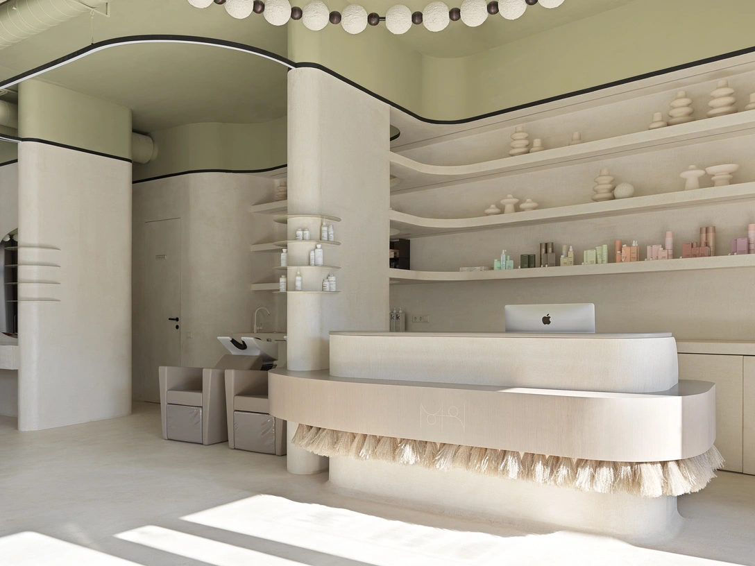 Идея абсолютной органики подходила к концепции бренда и нашла почти буквальное отражение в интерьере. Пластичные, гибкие, чувственные формы отсылают к природе. Рузанна решила сделать пространство максимально гибким — связать объемы между собой так, чтобы все зоны и плоскости перетекали друг в друга. Например, зона ресепшн, подиум педикюрной зоны и раковина в санузле плавно перетекают из плоскости в плоскость.