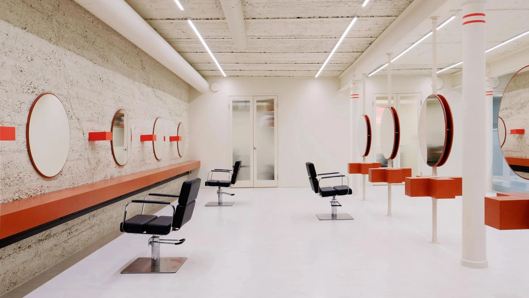 Главный зал салона Little Faktory делится на две зоны. На голубом постаменте за декоративной перфорированной решеткой стоят мойки для мытья головы. В центре — парикмахерская зона с необычными зеркалами и полками. Их простые геометрические формы отсылают к творчестве знаменитого итальянского дизайнера и архитектора Карло Скарпы (Carlo Scarpa). Зеркала и полки выкрашены в мягкий терракотовый цвет. Такую цветовую схему дизайнеры увидели на фотографии общественных бань 1920-х годов и взяли ее за отправную точку в работе над проектом.