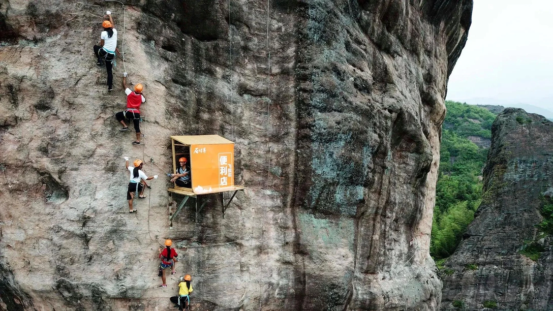 «Висячий» магазин в национальном парке Синючжай, известном своей живописной природой, был построен в 2017 году и начал принимать посетителей в апреле 2018-го. Скалолазы не согласны с тем, что это магазин неудобный — напротив, для альпинистов, преодолевших подъем на 120-метровую высоту, это просто подарок. Кроме воды, в нем можно купить легкие закуски и чипсы, и работает он круглосуточно.