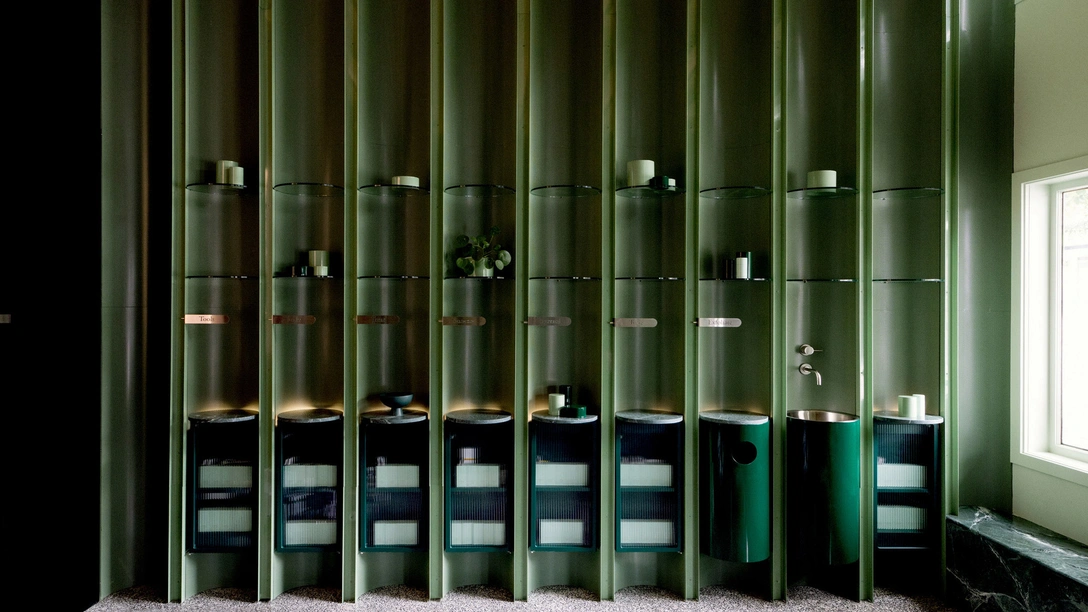 Стенки ниш выполнены из перфорированного металла, окрашенного в приятный оливково-зеленый цвет. В них находятся круглые раковины для процедур и полки с косметической продукцией из серого мрамора и прозрачного стекла. Контрастное сочетание материалов создает красивые визуальный эффект, а верхние стеклянные полки буквально парят в воздухе.