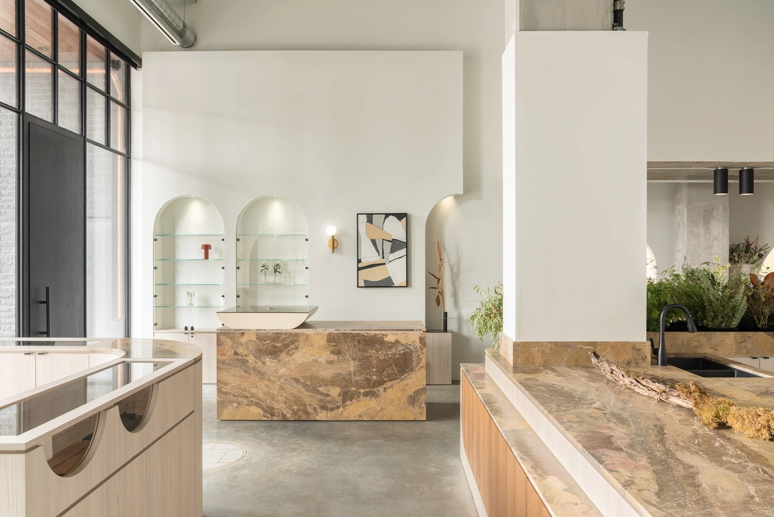 Интерьер наполнен органическими формами, которые проявляются в мягких изгибах предметов декора, сводчатых стеллажей и столярных изделий. Изящность линий уравновешивается высокими потолками и бетонными колоннами, привносящими ощущение монументальности и спокойствия. Все пространство окутано теплыми бежевыми и белыми тонами, которые создают уютную, непринужденную атмосферу, как дома у близких друзей.