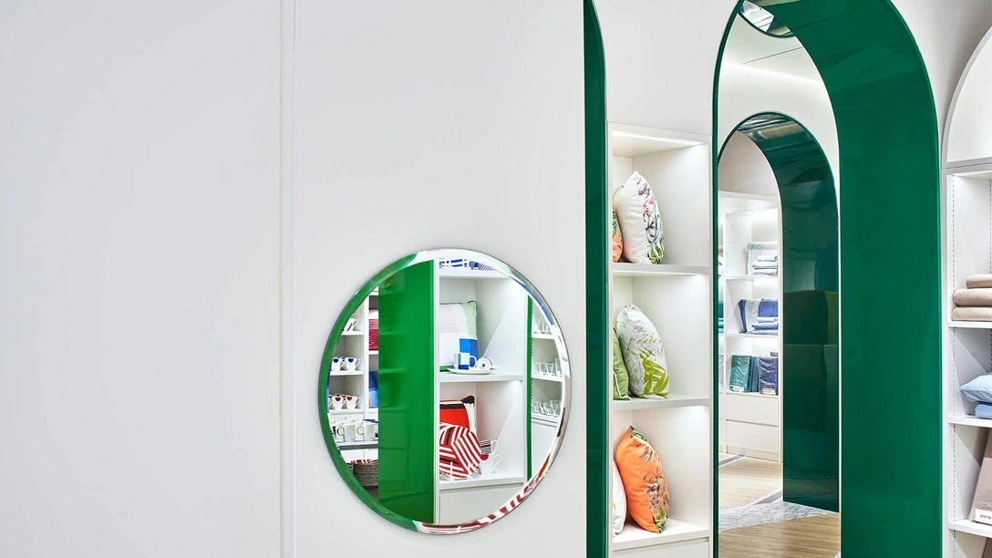 В самом деле, внутренне пространство магазина площадью 500 кв м представляют собой замысловатые футуристичные пространства с многочисленными арками, круглыми дверными проемами и нишами, которые служат явными отсылками к интерьерам Palais Bulles.
