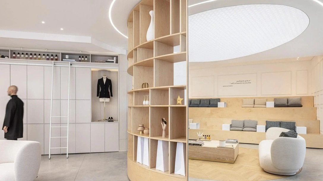 Архитекторы использовали белые и бежевые оттенки с латунными акцентами, чтобы создать теплую и уютную атмосферу. В сочетании с белым травертином, полированным белым мрамором, необработанным бетоном и светлым деревом эти материалы создают простую, но элегантную обстановку, которая, по мнению архитекторов, созвучна философии бренда Dior.