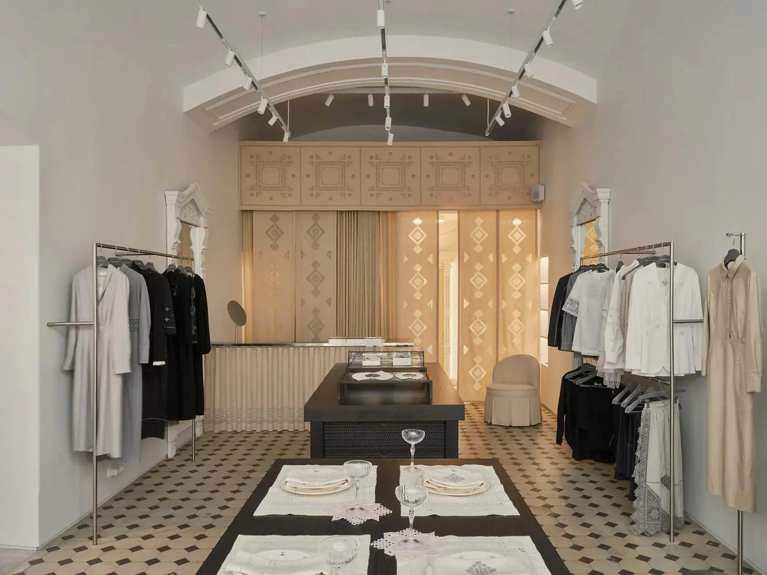 В этом проекте одним из ключей для создания визуального образа стала идея шоурума как театральной декорации, в которой покупателям легче представить себя в новом, необычном образе и поверить в атмосферу магической русской сказки. Так в интерьере появился «занавес» — он отделяет зоны примерочных и позволяет посетителям попасть в «закулисье» магазина, самим побывать в декорации.