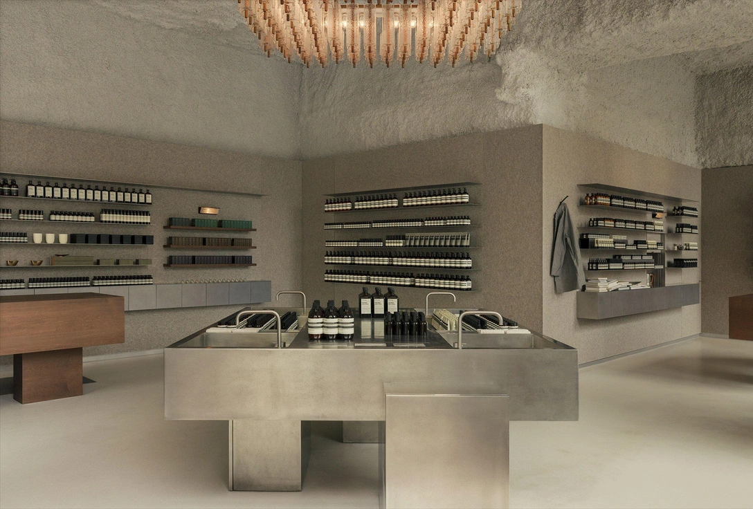 В Лионе недавно открылся второй по счету бутик Aesop. Интерьеры для него создала бельгийская студия Nicolas Schuybroek Architects, работавшая и над первым магазином. Они придумали лаконичное и в то же время артистичное пространство с интересными фактурами. Так, например, потолок и верхняя часть стен покрыты фактурной «шубой» из… огнестойкой пенопластовой пены! Это не то, что посетители привыкли видеть в магазинах: «мохнатые» поверхности из пены создают текстурный контраст с шерстяными панелями, обрамляющим нижнюю часть помещения.