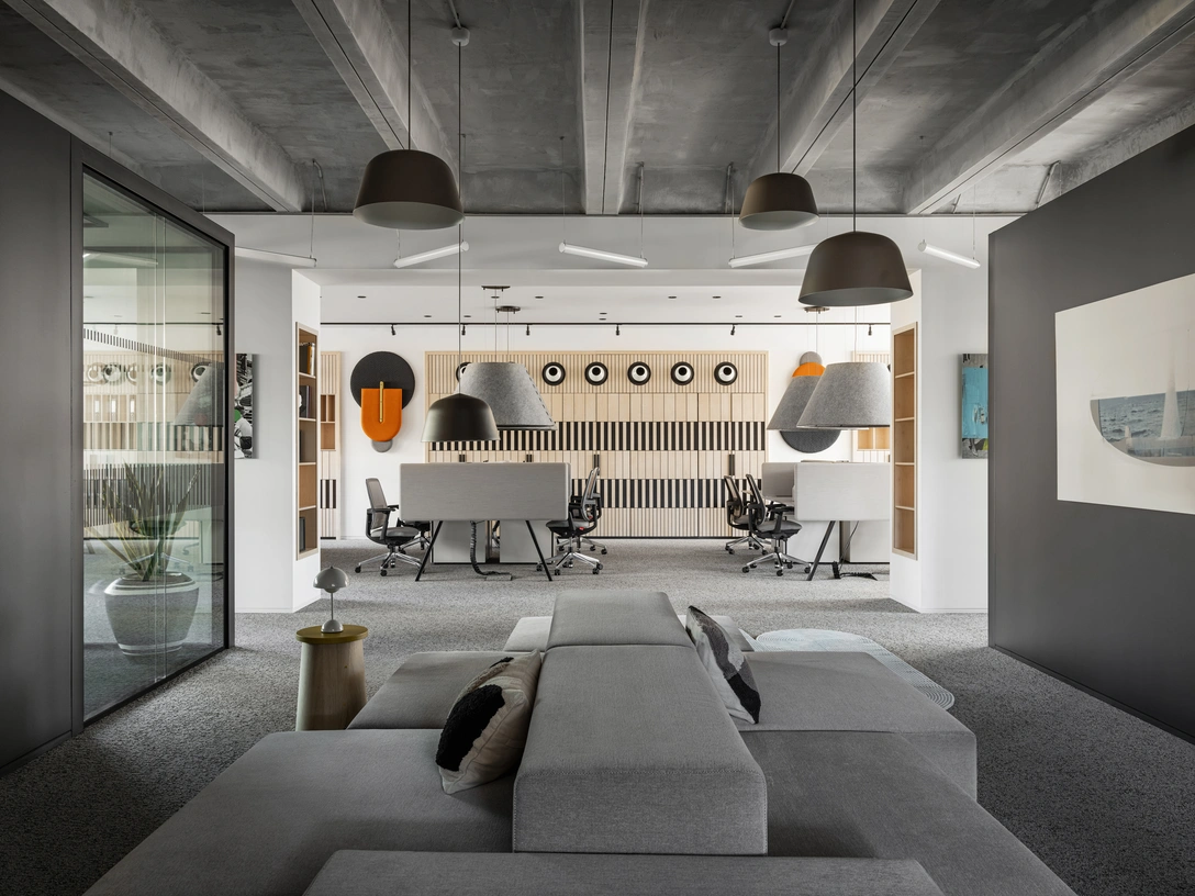 Офис занимает два этажа. На первом располагается ресепшн и кабинет руководителя. Чтобы избежать ассоциаций с советскими заводами, архитектор закрыл потолок сложной треугольной конструкцией, которая отсылает к залам музея Луиса Кана (Louis Kahn) в Йельском Университете. Для эффективной работы компании важно, чтобы руководство и коллектив общались между собой. Поэтому кабинет директора расположен так, что по дороге к своему рабочему месту он пересекается с сотрудниками.