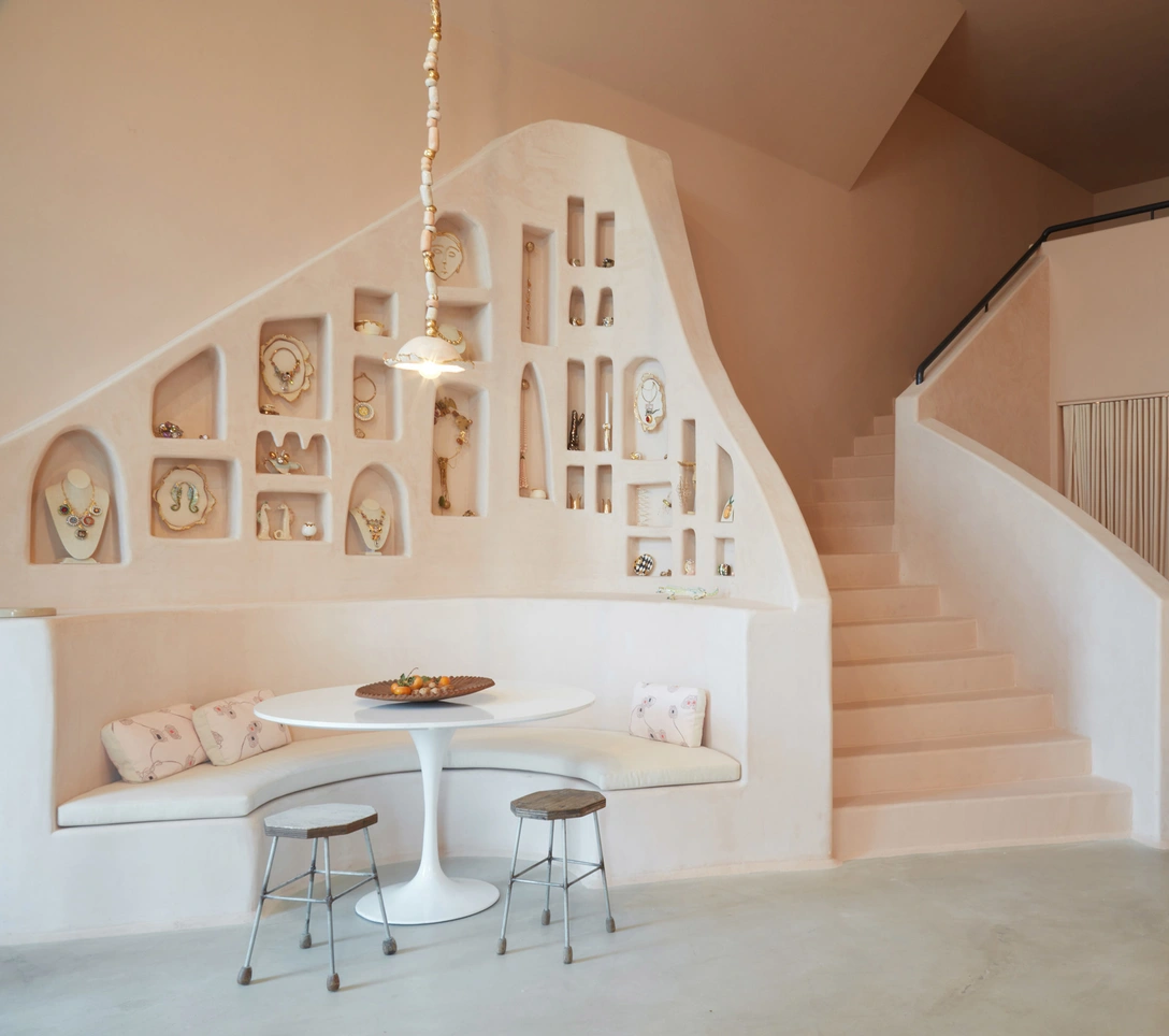 В качестве главного референса дизайнеры использовали интерьеры студии американской художницы-модернистки Джорджии О’Кифф (Georgia O’Keeffe) и отчасти работы художника Дональда Джадда (Donald Judd) — отсюда была позаимствована нежная пастельная гамма (в ней выдержано все пространство, включая полы, потолок и мебель) и мягкие текстуры. Главным украшением бутика стали ювелирные украшения — причем не только те, что выставлены на витринах, но и декоративные реплики размеров XXL, которые можно увидеть, например, в декоре люстр.