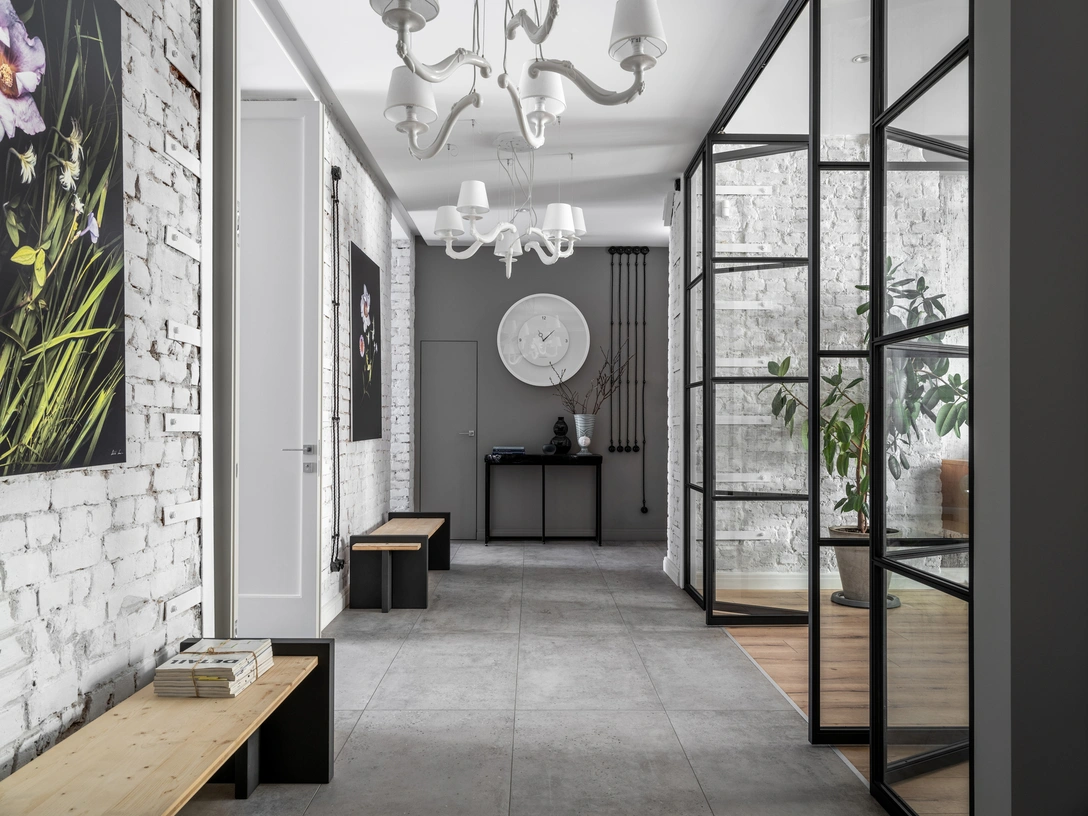 «Так как историческая отделка не сохранилась, нам пришлось расчищать стены до кирпича, укреплять проемы и потолки. Эстетика старой кирпичной кладки и стальных балок подсказала концепцию лофт-пространства, которую мы реализовали. Отсюда легкая, непринуждённая, светлая атмосфера с небольшим артистическим флером в дизайне: стеклянные перегородки, необычные светильники Karman, Vibia, Catellani & Smith, наружная электропроводка, аксессуары Bosa, Henry Dean, Asiatides, Serralunga. На стенах — сканографии Лены Суботы, художника и иллюстратора».