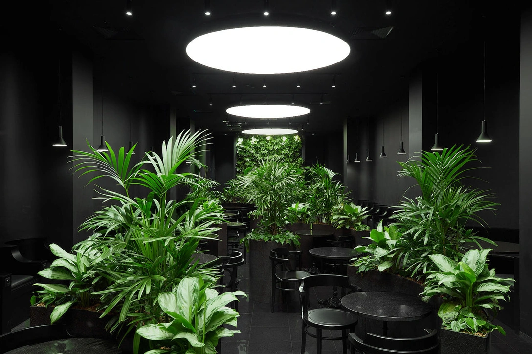 Так получился полностью черный бизнес-зал «Опал», густо засаженный зеленью, где каждый может найти себе укромное место по душе. Изящные кожаные кресла встроены в ниши, над которыми висят светильники индивидуального освещения, чтобы было удобно читать или работать на ноутбуке. Зеркала придают помещению глубину, отражая свет и пуская по полу блики, а пышные пальмы освежают пространство, напоминая о грядущем отдыхе.