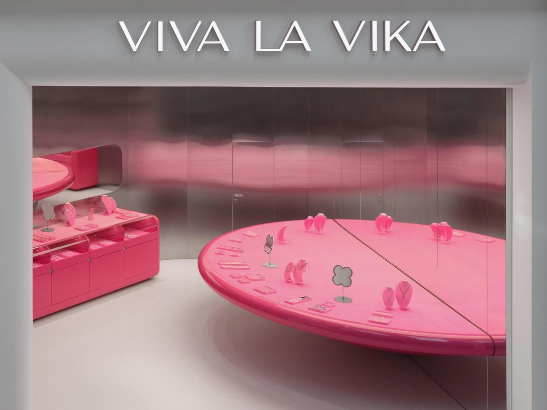 Новый магазин Viva la Vika продолжает узнаваемую эстетику других бутиков в Москве и в Санкт-Петербурге — плавные воздушные формы, яркий розовый цвет и металл.