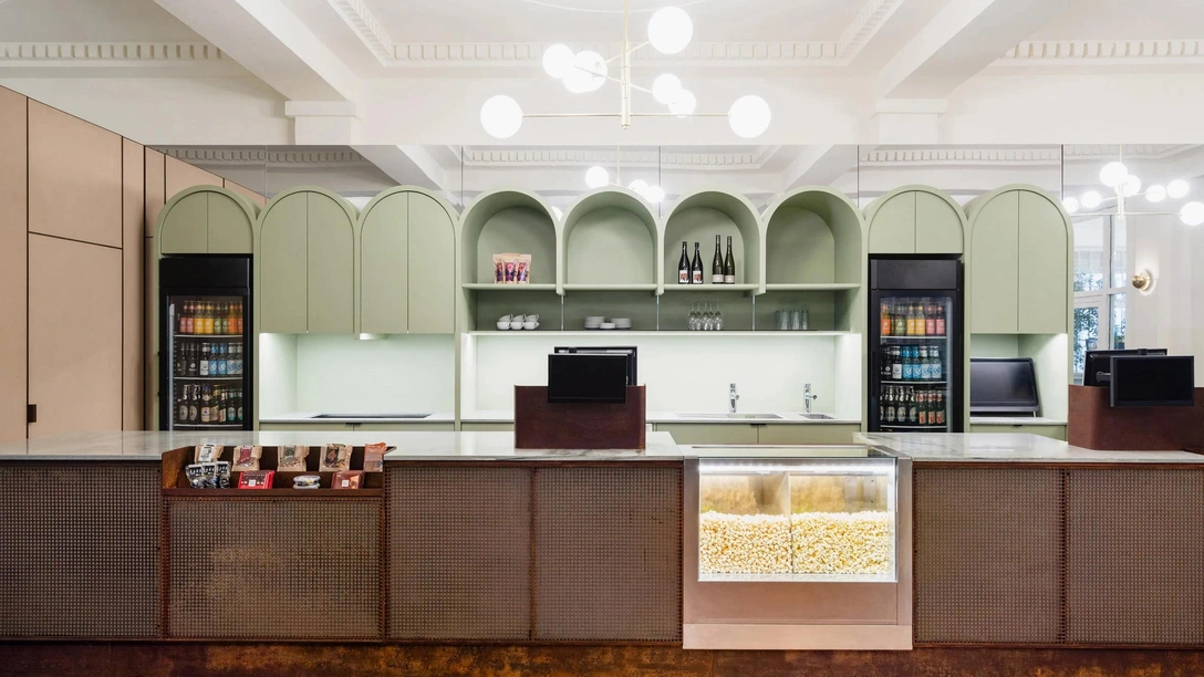 Облик фойе практически не изменился, за исключением новых панелей из пробки, за которыми скрываются помещения для персонала. Основной цветового решения стали оригинальные полы красновато-коричневого оттенка, с которыми контрастирую фисташковые арки бара. «Мы хотели сохранить пол как часть архитектурного наследия и в выборе цветовой палитры отталкивались от него. Затем нам захотелось добавить чего-то яркого и неожиданного — так появились фисташковые арки», — говорят в студии.