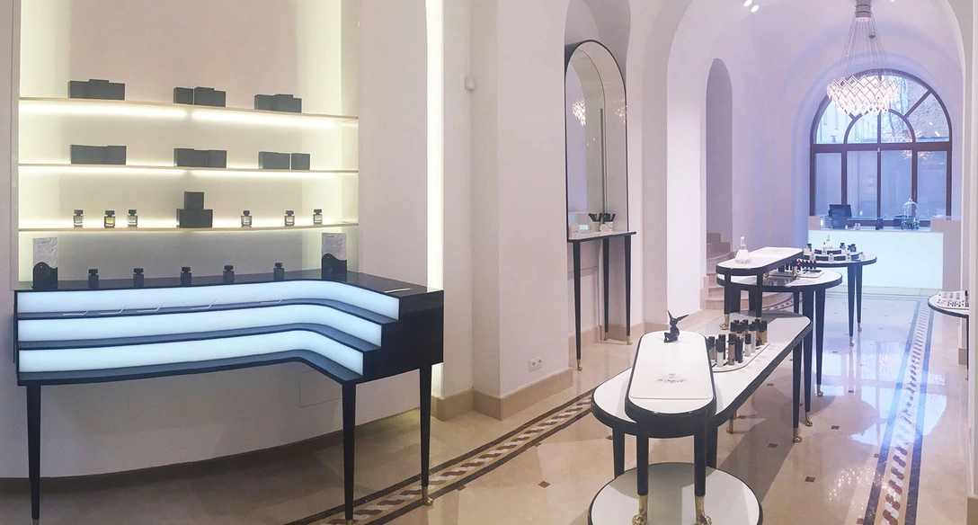 Недавно бьюти-бутик Rouge Bunny Rouge открылся в Москве. Это первый собственный магазин компании в мире. До сих пор продукция бренда была представлена в корнерах партнеров. Вслед за московским шоу-румом, магазины оформленные в новом стиле, откроются в других странах Европы. Дизайн интерьера разработали участники дизайн-бюро StudioBility из Исландии. Проект выдержан в традиционной черно-белой гамме и по-новому цитирует образы викторианской эпохи. Необычная мебель и витрины на изящных ножках, увенчанных львиными лапами, создают сказочную, рафинированную атмосферу. Даже стенд для тестеров выглядит как элемент театральной декорации, по форме он напоминает пианино или туалетный столик из дворцового будуара.