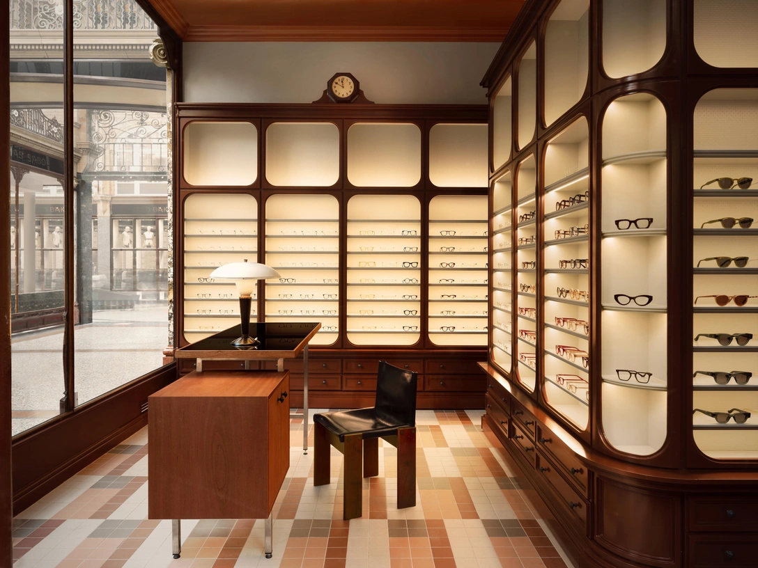 Большую часть магазина занимают трехметровые стеллажи, повторяющие геометрию оригинальных витрин. Глянцевый лак шоколадного оттенка контрастирует с белыми фактурными обоями, которыми оформлены полки для очков. Рисунок пола также вдохновлен архитектурными деталями здания. Студия использовала глиняную плитку терракотовых, песочных и антрацитовых оттенков, которые перекликаются с цветовой палитрой галереи.